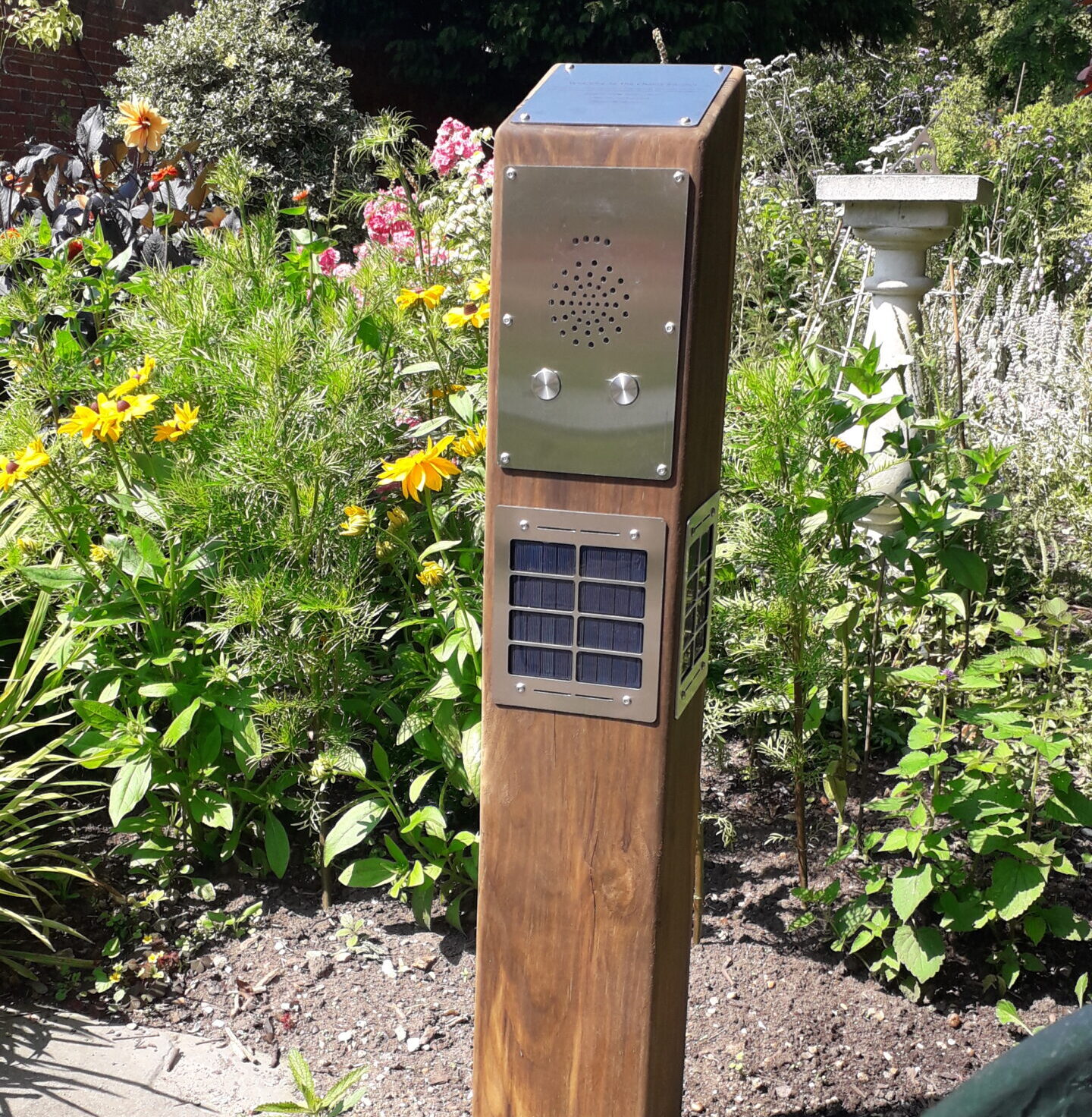 The Listening Post relates memories of Sawston’s history, recorded by older, long term residents. It stands in the flower gardens close to the back door of the Challis House, next to a metal table and chairs. Simple operating instructions, and a guide to current content (frequently updated), are kept in the attached document holder.