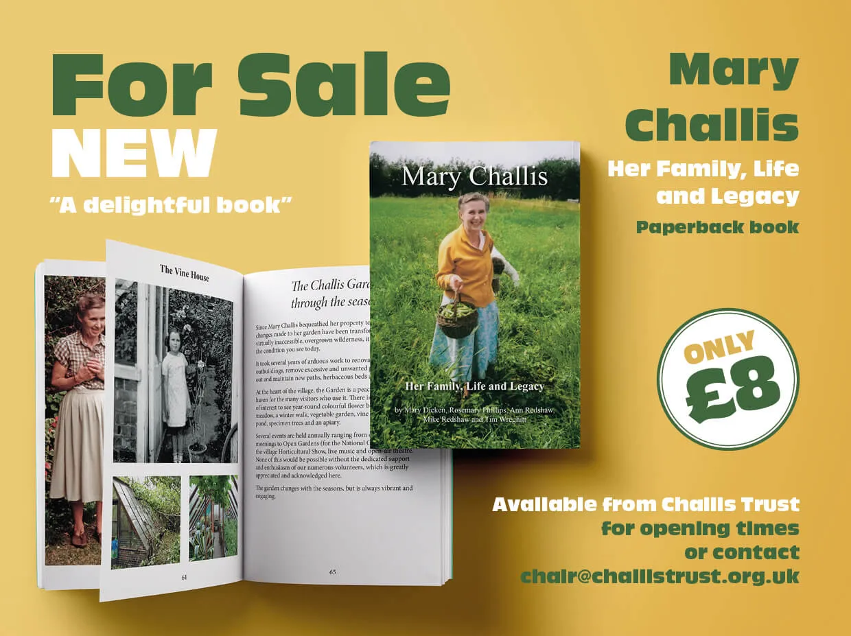 Mary Challis - Her family. Life and Legacy, published in 2025 to commemorate the centenary of her birth, explores her family background in Sawston, going on to outline her life and interests. It pays tribute to the Trustees and many Volunteers who have transformed the house and garden, since her bequest in 2026. It also depicts the state of the house and garden then and now.
